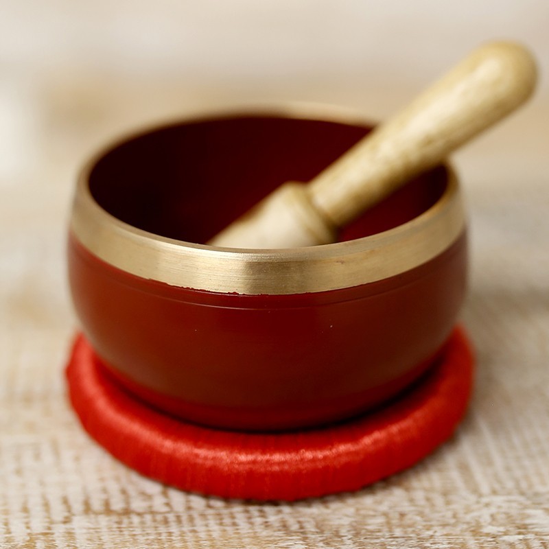 Cuenco tibetano rojo para meditación, relajación y armonización energética, ideal para crear un ambiente espiritual y decorativo.