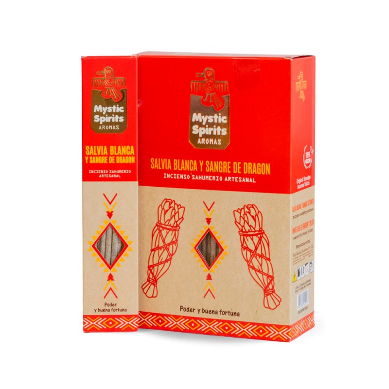 Incienso sahumerio artesanal Mystic Spirits de Salvia Blanca y Sangre de Dragón, elaborado en India con ingredientes naturales para ofrecer una experiencia intensa, espiritual y purificadora, ideal para limpiar energías y armonizar espacios.