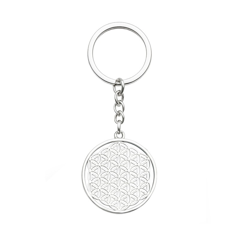 Llavero simbólico en acero inoxidable con diseño Flor de la Vida, inspirado en la geometría sagrada y adecuado como complemento personal o representativo.