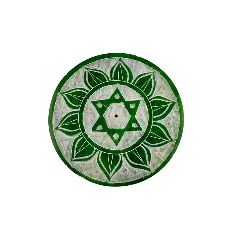 Plato porta incienso de piedra con Estrella de David en tono verde, ideal para colocar varillas de incienso y recoger la ceniza de forma limpia y ordenada. Una pieza compacta y decorativa, perfecta para altares, meditación, protección energética y rincones espirituales.