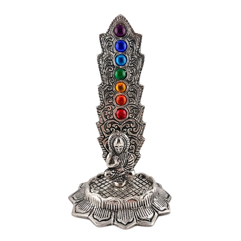 Porta inciensos vertical con figura de Buda y detalles de los 7 chakras en colores. Una pieza decorativa y espiritual, ideal para quemar varillas de incienso con estabilidad mientras creas un ambiente de calma, meditación y armonización energética en tu altar, sala o rincón zen.